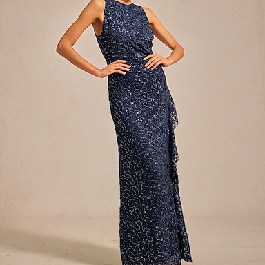 Femmes Robe maxi Robe fourreau Élégant Soirée robe demoiselle d honneur Paillettes A Volants Scintillant Coupe régulière Couleur Unie Sans manches Col ras du cou bleu marine