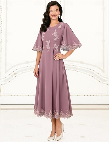 Robe de fête longueur thé A-Line robe cocktail robe d'invitée de mariage robe de mère de la mariée manches 3/4 décolleté rond élégante vintage formelle dentelle avec dentelle