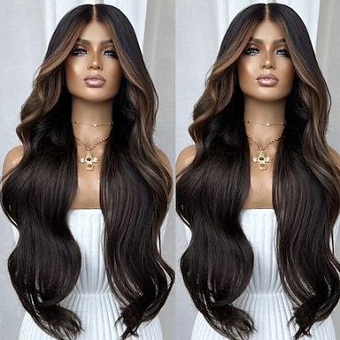 Perruques longues à reflets bruns pour femmes, perruques blondes mélangées brunes ombrées avec racines noires, perruques synthétiques longues bouclées et ondulées avec ligne de cheveux en dentelle,