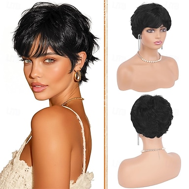 Perruque pixie noire pour femme - coupe courte naturelle dégradée, perruque synthétique résistante à la chaleur pour déguisement quotidien