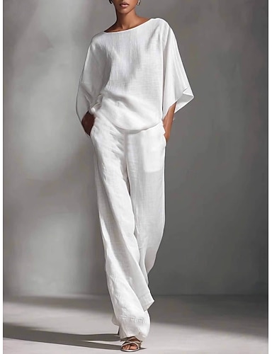 Femmes Ensembles en coton et lin Manche 3/4 Col rond Vacances Basique Occasionnel Quotidien Vacances Noir Blanche bleu marine Été Coupe Ample