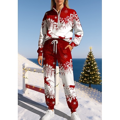 Noël Femmes Sweat-shirt Ensemble Survetement Survêtement Cordon de serrage Fermeture éclair Veste et Pantalon de Jogging Ensemble de vêtements de sport Printemps Blanc + Rouge Noir avec blanc