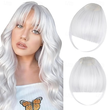 Frange à clip, frange naturelle à clipser, frange française blond clair décoloré avec mèches sur les tempes, extensions de frange pour femme, à porter au quotidien.