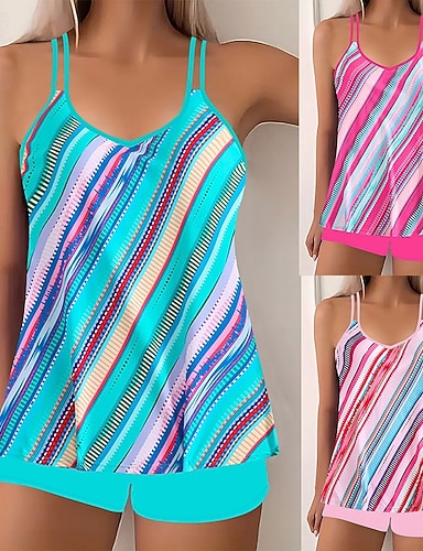 Femmes Maillots de Bain 2 pièces Shorts Maillot de bain Dos nu Vacances Tenues de plage Rayé Col rond Sans manches Maillots de bain