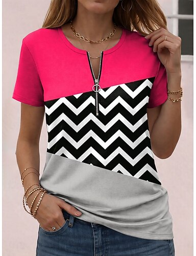 Femmes T-shirt Fermeture éclair Bloc de Couleur Graphique Géométrique Bloc de Couleur ancien Hawaïen Élégant Manche Courte Col ras du cou Hauts Réguliers Quotidien Sports Week-end Bleu Rose Claire
