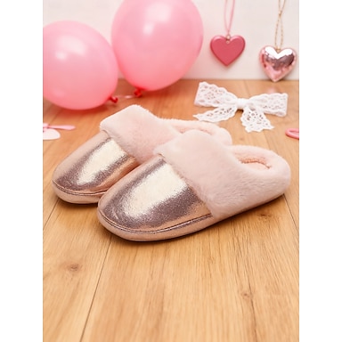 Pantoufles d'intérieur roses métallisées pour femme, bordées de fausse fourrure – des pantoufles brillantes et moelleuses à enfiler, idéales pour la chambre, les journées spa, les demoiselles d'honneur et les cadeaux de Saint-Valentin.