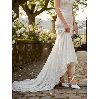 Chaussures de mariée en dentelle ivoire pour femme, ballerines de mariage à petit talon et bout pointu avec bride cheville, élégantes et confortables pour les cérémonies de mariage.