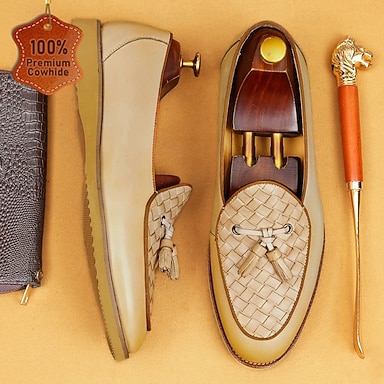 Mocassins à pampilles en cuir véritable beige de qualité supérieure pour homme, chaussures habillées de luxe à enfiler, idéales pour le marié, les invités, les mariages en plein air, les réceptions et les occasions spéciales pour un gentleman élégant.
