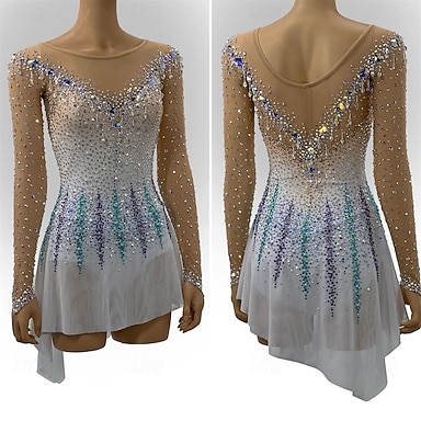 Robe de patinage artistique Femmes Fille Patinage Robe Blanche Patchwork Ourlet asymétrique Maille Haute Élasticité Entraînement Compétition Tenue de Patinage Classique cristal pailleté manche longue