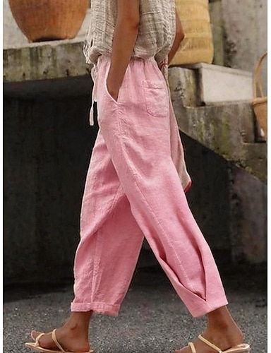 Femmes Faux coton lin Chinos Pantalon d'été Droit Vacances Basique Occasionnel Longueur complète Taille haute Uni Avec Poches Ceinture Élastique Confortable Confort Doux Micro-Élastique Extérieur Rue