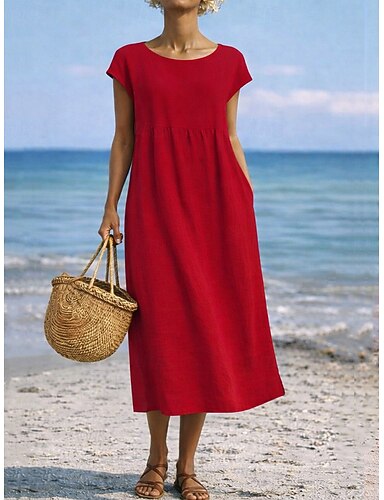 Femmes Robe Midi Faux coton lin Robe Décontractée Élégant Mode Moderne Quotidien Extérieur Vacances Coupe Ample Uni Manche Courte Col ras du cou Noir Blanche Rouge bleu marine Été Printemps