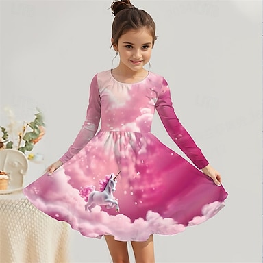 FILLE 3D Graphic Licorne Robe manche longue Eté Printemps Vacances du quotidien Princesse Magnifique Doux Enfants 4-12 ans Robe casual Robe Trapèze Mi-long Standard