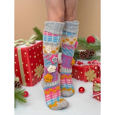 Chaussettes hautes au crochet pour femmes sur le thème de Noël, motif carré de grand-mère, motif en tricot multicolore pour les fêtes de fin d'année et la mode hivernale