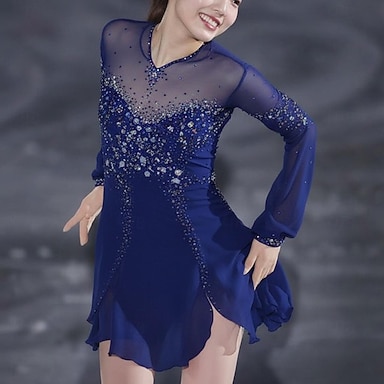 Robe de patinage artistique Femmes Fille Patinage Robe Bleu / Noir Patchwork Maille Haute Élasticité Entraînement Compétition Tenue de Patinage Classique cristal pailleté manche longue Patinage sur