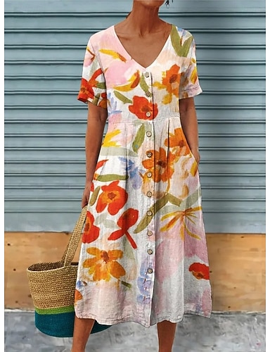 Femmes Robe Midi Robe fourreau Vacances Occasionnel Boho Coupe régulière Fleuri Graphique Manche Courte Col en V Fuchsia Orange Été Printemps