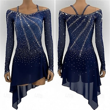 Robe de patinage artistique Fille Patinage Robe Bleu Noir Patchwork Ourlet asymétrique Haute Élasticité Entraînement Compétition Tenue de Patinage Classique cristal pailleté manche longue Patinage