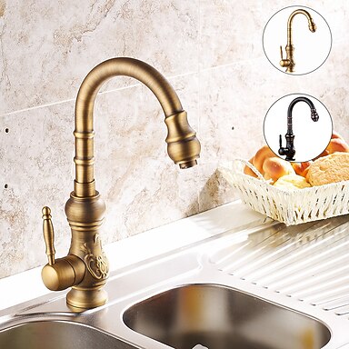 Robinet de cuisine à une poignée, robinets de robinet de cuisine en laiton répandus rotatifs à un trou en cuivre antique avec eau chaude et froide