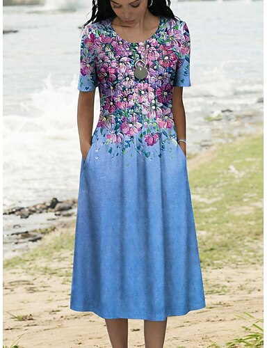 Robe midi femme à fleurs bleues et blanches, coupe trapèze, idéale pour les vacances, la plage, un rendez-vous, un rendez-vous, un imprimé floral ample, manches courtes, col rond, bleu, jaune, rouge, violet, été, printemps