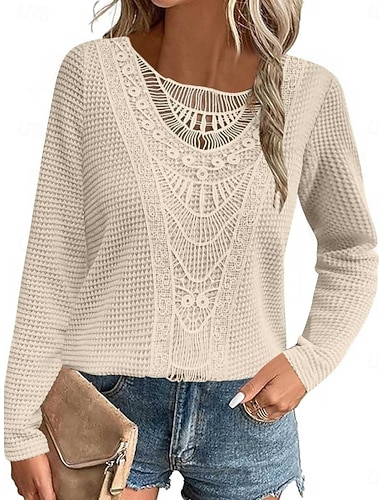 T-shirt pour femmes unie couleur élégant décontracté manches longues col rond tops réguliers quotidiens patchwork dentelle noir vin vert armée bleu marine brun printemps automne hiver