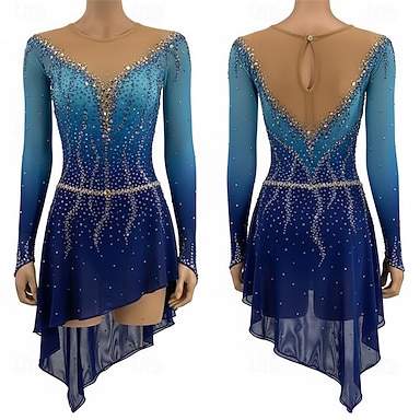 Robe de patinage artistique Femmes Patinage Robe Bleu Patchwork Ourlet asymétrique Élastique Haute Élasticité Entraînement Compétition Tenue de Patinage Classique cristal pailleté manche longue