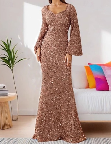 Femmes Robe Longue Maxi Robe Robes à paillettes Robe de Cocktail Robe fourreau Élégant Mode Moderne Manches Evasées Soirée Occasion Spéciale Coupe régulière Uni manche longue Col en V Argent Rose