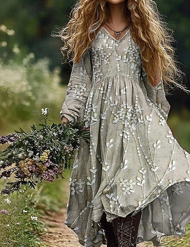 Femmes Robe Maxi Robe bohème Robe Vintage Robe Décontractée ancien Quotidien Extérieur Vacances Coupe Ample Fleuri manche longue Col en V Bleu Printemps Automne