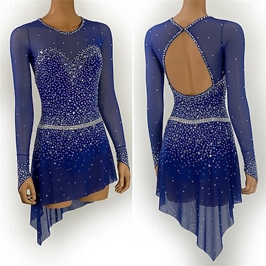 Robe de patinage artistique Femmes Patinage Robe Bleu Patchwork Dos Nu Haute Élasticité Entraînement Compétition Tenue de Patinage Classique cristal pailleté manche longue Patinage sur glace Patinage