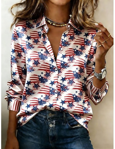 Jour de l'Indépendance Américaine Femmes Chemise Graphique Géométrique Bloc de Couleur ancien Élégant Moderne manche longue Col de chemise Hauts Longs Quotidien Fête Blanc et rouge Kaki Été Printemps