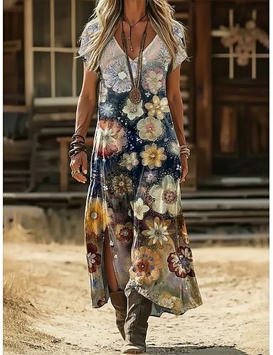 Femmes Robe maxi Robe bohème Robe Décontractée Robe trapèze Robe Imprimée ancien Extérieur Vacances Week-end Coupe régulière Fleuri Graphique Manche Courte Col en V bleu marine Violet Vert Ét