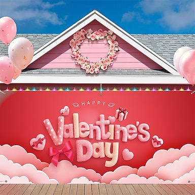 Décoration de porte de garage pour la Saint-Valentin, avec l'inscription « Joyeuse Saint-Valentin » en lettres bulles, sur fond rouge et rose. Parfaite pour décorer votre maison ou votre vitrine à
