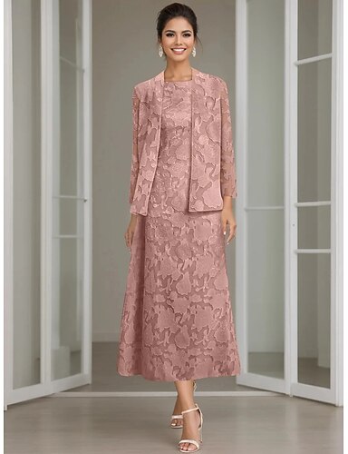 Deux Pièces Fourreau Colonne Ensembles de Robes Mi-long Robe d'invité de mariage Robe de Mère de Mariée Manche 3/4 Bijoux Élégant Simple Formel robe demoiselle d honneur Tissu Extensible Robes avec