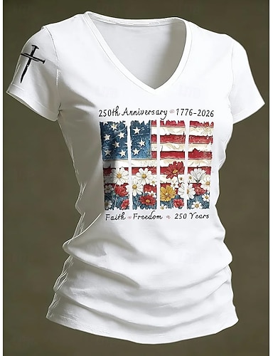 Jour de l'Indépendance Américaine Femmes T-shirt Imprimé Graphique Drapeau Élégant Occasionnel Manche Courte Col en V Hauts Réguliers Quotidien Noir Blanche Rouge Été Printemps