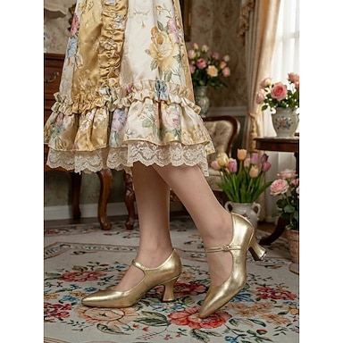Escarpins Mary Jane rétro victoriens dorés pour femmes - élégants escarpins à bout pointu et petits talons métallisés &bride de cheville pour soirées vintage, mariages &costumes rococo