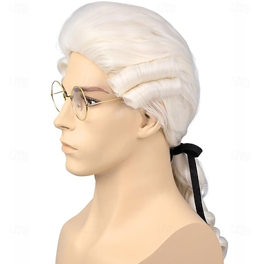 Perruque blanche pour homme, style colonial, longue, blonde, poudrée et ondulée, idéale pour un déguisement, un cosplay ou une soirée.