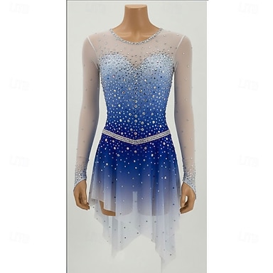 Robe de patinage artistique Femmes Patinage Robe Bleu Patchwork Ourlet asymétrique Élastique Haute Élasticité Entraînement Compétition Tenue de Patinage Classique cristal pailleté manche longue