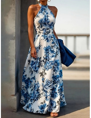 Femmes Robe maxi Robe trapèze Robe dos nu Vacances Occasionnel Extérieur Sortir Coupe Ample Fleuri Sans manches Col Halter Bleu Été Printemps