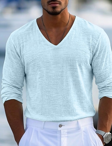 Homme T-shirt T-shirt en lin manche longue Col en V Printemps & Été Été Printemps Couleur Unie Uni Texturé Quotidien Occasionnel street style Pur Occasionnel Extérieur Rue Bleu Clair Noir Blanche