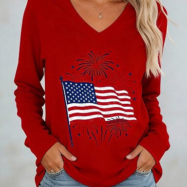 Femmes T-shirt Imprimé Graphique Drapeau Américain ancien Élégant Classique manche longue Col en V Hauts Réguliers Quotidien Sortir Week-end Blanche Rouge bleu marine Kaki Été Printemps