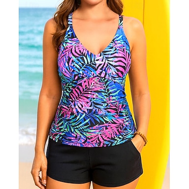 Maillot de bain 2 pièces tankini femme shorts palmier contrôle du ventre taille haute ajusté sans dos vacances plage floral col rond sans manches