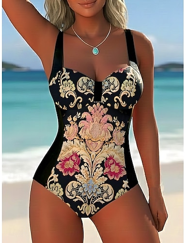 Maillot de bain une pièce pour femme amincissant boho monokini contrôle du ventre taille haute slim sans dos vacation plage graphique floral col en U sans manches