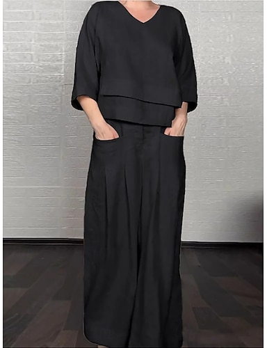 Femmes Ensembles de Pantalons Faux coton lin Manche 3/4 Col en V Uni Froncé Patchwork Élégant Mode Streetwear Occasionnel Quotidien Extérieur Noir Blanche Bleu Marine Été Coupe régulière