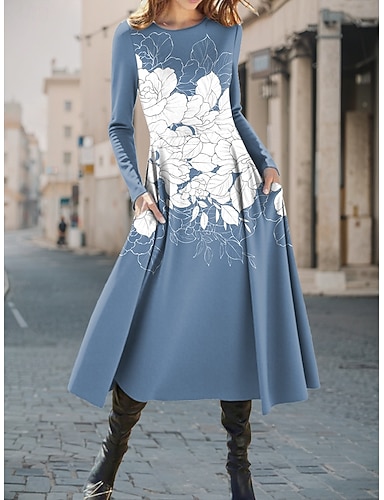 Robe midi femme Robe en A Robe décontractée Robe d'hiver Robe swing Mode Streetwear Mature Formelle Extérieure Vacances Fit régulier Florale Manches longues Col rond Bleue Verte Automne Hiver