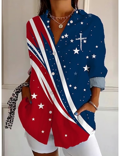 T-shirt Femme Journée de l'Indépendance Américaine Imprimé Graphique Boutons Anniversaire d'Amérique Vintage Élégant Moderne À Manches Longues Col de Chemise Hauts Quotidiens Bleu Noir Rouge Rouge