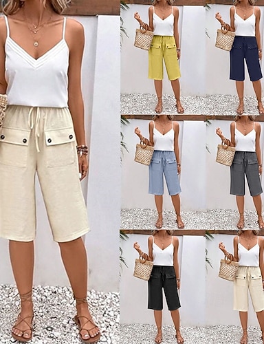Femmes Pantalon capri Faux coton lin Chinos Shorts Vacances Streetwear Basique Longueur Genou Taille moyenne Uni Avec Poches Ceinture Élastique Confort Respirant Non Elastique Quotidien Extérieur Rue