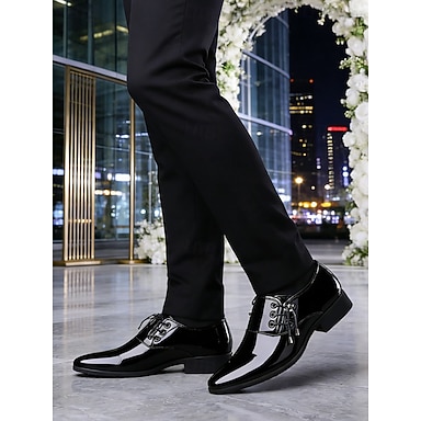 Chaussures habillées de luxe pour hommes en similicuir verni - noir et blanc, design élégant et formel, idéales pour les soirées et les mariages.