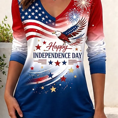 Jour de l'Indépendance Américaine Femmes T-shirt Imprimé Graphique Drapeau Américain Élégant Classique Occasionnel manche longue Col en V Hauts Réguliers Quotidien Sortir Week-end Bleu bleu marine