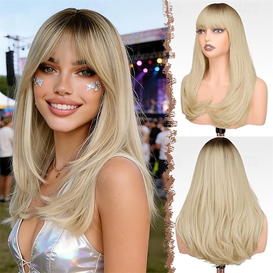Perruques blondes lisses en couches avec racines foncées pour femmes, perruque résistante à la chaleur avec frange pour un usage quotidien