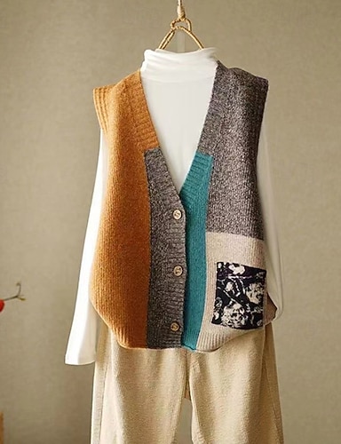 Femmes Pull Pull Gilet Streetwear Occasionnel Bloc de Couleur Col en V Patchwork Tricoté Sans manches Hauts Réguliers Tricoter Quotidien Fête Sortir Jaune Rouge Printemps Automne