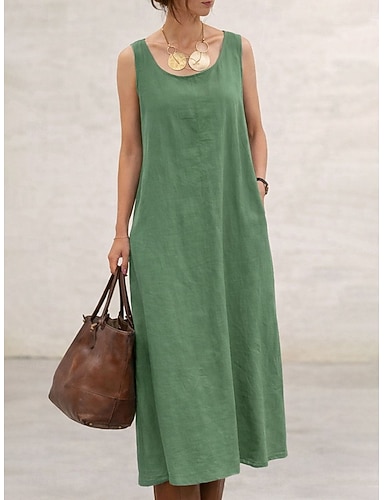 Femmes Robe maxi Faux coton lin Robe fourreau Robe d'Été Basique Occasionnel Quotidien Vacances Coupe régulière Uni Sans manches Col ras du cou Jaune bleu marine Vert Été