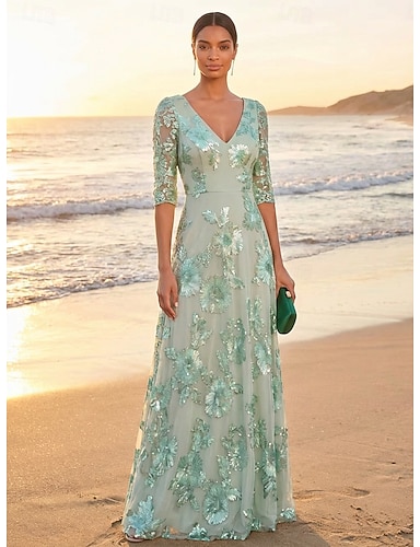 Ligne A Robe Longueur au sol Robe de Soirée Robe de Cocktail Robe de Mère de Mariée Demi Manches Col en V Élégant ancien Luxueux Formel robe demoiselle d honneur Kentucky Derby Dentelle Tulle avec